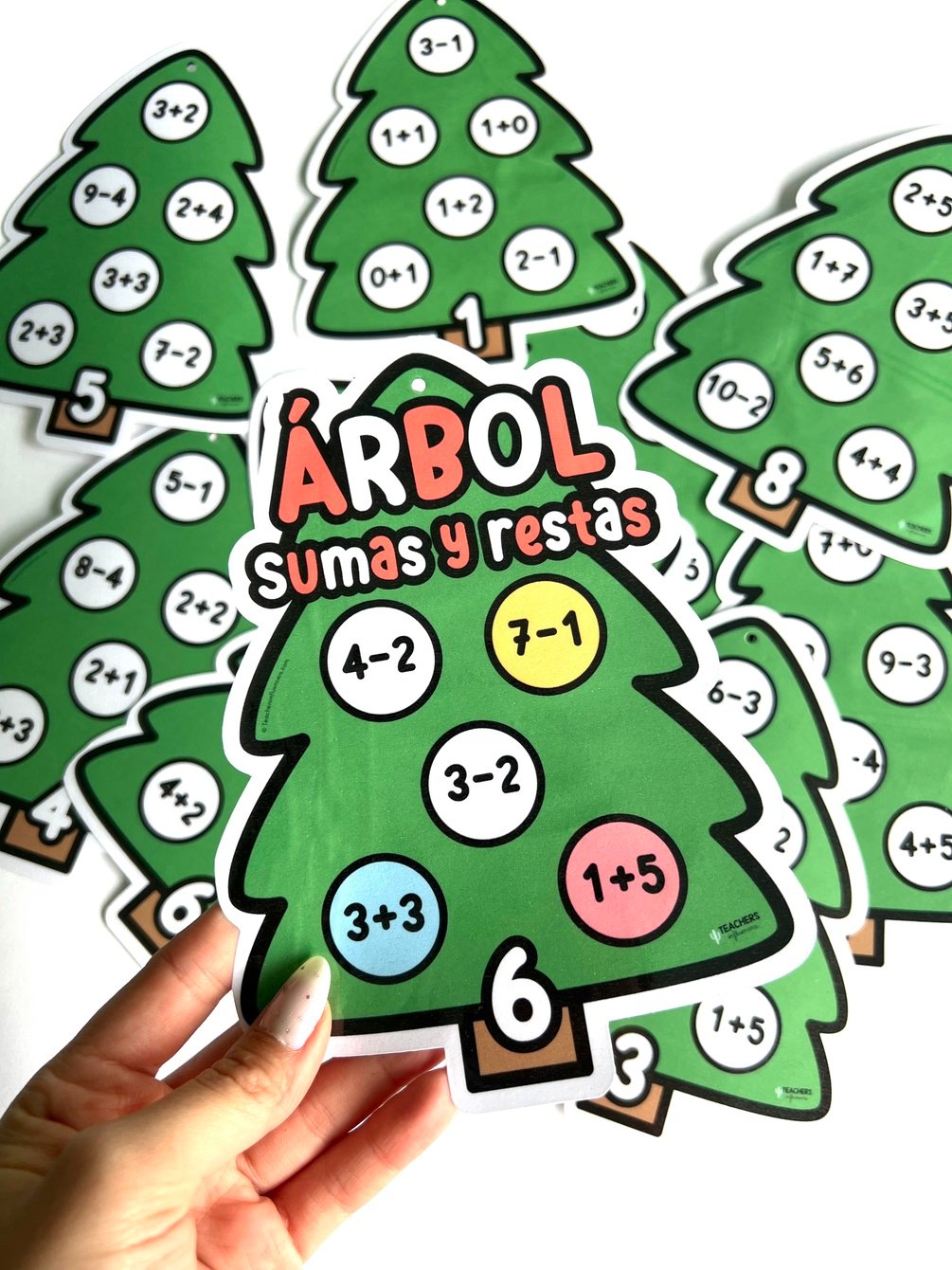 Descubre las bolas del árbol de navidad con el resultado correcto. Cada árbol incluye un número del 1-9 en el tronco, hay que hacer la operación para descubrir qué bolas corresponden a ese resultado y colorearlas o colocarles una ficha encima.